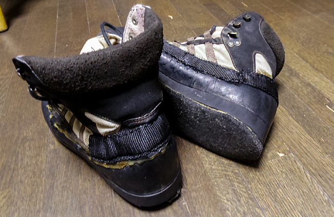2016/01/04 ウェーディング・シューズを補修しました。 正月休みはダラダラと過ごしたかったけど、そうもいかず、12月26日の連休初日から、29日までは大掃除に明け暮れて・・・ そのあとは、去年もそうだったけど、お節料理を作ったり・・・と忙しかったです。 元旦から3日まで、お付き合い等で、忙しかった・・・ なんか10連休もあっという間で、バタバタだった。まったりと過ごす時間もなかったけど、そんな中、暇を見つけては、ウェーディング・シューズの補修をしてました。 昨年も補修して、「まっ、今シーズン、履きつぶして、来シーズンは新しいのを買おう」 と思うけど、またまた補修してしまい、もう十数年履いている、今は無き?(今でもあるのかな?)リバーガイドっていうところのシューズで、確か製造したのは、キャラバンだったと思います。 しかし、さすがに、ボロになってしまって、もうお役ご免だな。って思ったけど、バックルのナイロンベルトがあったので、これを破れているところに、縫ってみようって思って、手縫い機を使って、ひと針、ひと針、縫う作業は、「か〜さんが、夜なべ〜をして、手袋編んでくれた〜♪」っていうBGMがよく似合いました。