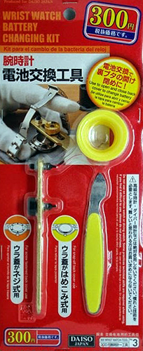 首尾良く、ウラ蓋を外すことに成功。電池を取り出します。めっちゃ小さいボタン電池。ルーペを持ってきて型番を調べます。ここまで来たら、新しい電池をゲットして復活させたい。 で、大口アピタの2Fにダイソーがあったよなぁ・・・あそこなら21時30分までやっているよなぁ・・・ って思ったのが20時45分。買いに行きました。レジの横にボタン電池があって、そこに同じ型番のがありました。 で・・・ 他の物も欲しかったのでダイソー店内を回っていたら・・・ 始めにご説明した、ダイソーの腕時計交換工具ってのが、あった・・・ う〜・・・・ なんであるの? ちょっとショックだわ〜 探していた物が見つかったので思わず買おうとしたけど、これから帰って電池交換すれば3年、4年は持つから次回、電池交換は早くて3年後だよな・・・ それに苦労して作った自作のも有るし・・・ってあきらめました。 でも唯一の救いは、300円だったのが、400円になっていた事でした。消費税入れれば432円だから、作った方が安かったっていうのも、救いだよな・・・