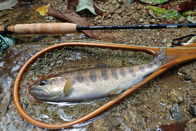 林道の横は右隣谷なので、観察しながら進んでいきます。ゲートからしばらく行くと伐採地と、伐採した材木をプールしておく場所に出まして、ここらあたりの林道がかなりグチャグチャ&泥々で難儀しました。 時々、谷を見ますが、浮いている魚もいます。足跡も無くて、釣り人が入った形跡がないような感じなのよね。あれ?あの大きなお車の方は釣りではなかったのか?キノコ採り?って思っちゃうけど・・・ とか思いながら進んでいくと橋があって林道が対岸に移動。橋の下はプールになっていたけど、魚は浮いていなかったです。そのまま行くと、堰堤出現〜。堰堤下のプールを見たら魚が2.3匹だけど浮いていた。先行者があるのか無いのかわからんけど、とりあえず浮いている魚を見たので、橋まで戻って、そこから堰堤までを釣ってみようと思いまして、橋まで戻って、そこらの立木にワイヤーロックで電動自転車をくくりつけておこう!って思って、荷台のカゴの中を見たら・・・ ワイヤーロックが無いではないか!車に忘れてきた〜 誰も来ないと思うが、気になって釣りに集中できないと思うから、戻ろう・・・って そんでもって、ふと、アルミのロッドケースを見たら、黒いキャップが無い! ギュッって閉めていなかったようで、林道を走行する振動でキャップが徐々に緩んで、とうとう落ちたって事だろう。でもどこで落ちたか判らないし、転がっていったらもっと判らない。意気消沈〜。とりあえず戻る。戻る途中で、黒いキャップがあればラッキーだろうって、ゆっくり林道を下るのでした。 しか〜し・・・車に到着するまでの間、黒いキャップは落ちていなかった・・・。あ〜、また買わなくてはならんのか・・・。とか思う。それよりも、ナニやってんだオレ???って落ち込む。せっかく9時頃、到着したのに、まだ新竿、振っていないぞ。すでに10時半だし・・・ もういいや、ここから釣ろうって、車を駐めたところから入渓。 やっとこせ釣りが始まったのでした。 昨日、買ってきたばかりのロッド。竿の善し悪しなんで口に出来るほどでもないけど、まぁ、こんなもんかな。欲を言えば、もう少しバットに張りが欲しいかなって感じ。後日、感想を加筆 9/25 入渓してすぐに、アマゴが釣れました。入魂完了ってやつですかねぇ・・・ サイズの割りには太ってた。