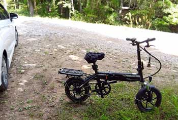 9月16日(土) 昨日、名古屋の釣り道具屋へ行き、ユーフレックスちゅうところの、バックパッカー703−6Pを買ってきました。まもなく禁漁ですし、ここんとこ左ヒザも調子悪いから、本来なら釣りに行かず養生した方が良い。と思うが・・・ なんで買ったの?って思うけど、日々のストレス発散でしょうか・・・。 買ったら、使ってみたいって思うのは人情ってもんだがや〜 それで出撃〜。 それと、もうひとつ、今回、ACFC-Y師匠にお渡ししたいブツがあって、Y師匠は本日、山の家に行かれるらしいので、そこでお会いしましょう。って事に話がなってて、はじめは、足が痛いから釣りはやらず、お喋りして帰宅ってことにしてたけど、そこにロッド買っちゃったんで、ヒザが痛いけど、ちょこっと釣りしてみよう。ということにしました。 さてさて、本日、18時には帰宅しないといけません。午前中の釣りになります。頑張って起きて7時に出発。(普通のお方は7時に実釣開始だろうけど・・・)高速使ったのと、意外に道路が空いていたんで2時間チョイで到着してしまいました。でも、その道中、いたるところに釣り人のお車が止まっていました。もう禁漁間近だもんねぇ〜。 去年は、掛け軸さんと左隣谷に入ったから今回は右隣谷に行ってみようと思っていまして、右の林道をドンドン進んでいきます。どこかにゲートがあると聞いていましたけど、思ったよりも先でした。その間、釣り人の車はなかったのが以外でした。しかし、ゲートの手前に、おっきなお車が・・・。んじゃ、もう少し下って、適当に入渓しようって思って戻ってから支度をしていたら、おっきなお車が帰って行きましたので、もう一度ゲートの前まで戻りました。これじゃあ、人の後追いになるんだけど、ゲートの向こうとその先にある堰堤プールが見たかったんです。なので、本日は、ジャジャーン〜。折り畳み電動自転車を持ってきたのよね〜。