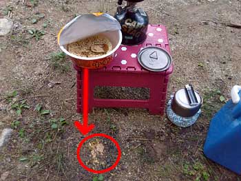 アカギのカップ・中華そば。意外に好きなのよ。今日は、これと、ノンアルとおにぎりという質素な昼食です。 湯を沸かして、さて、カップに注ごうとしたとき、コッヘルの取っ手が熱かったんで「あちっ」って瞬間的に手が動いたら、カップ麺に当たって、カップが落下〜・・・ 粉末スープとフリーズドライの具材が〜、地べたに・・・ 赤丸の所です。 なんてこった! ほぼ、半分くらい粉末スープはダメになっちまった。困った。 でも半分はカップの中にあるってことは、湯を半分入れればいいんでなの? と思って、半分湯を注ぎます。3分待って、実食です。スープの濃さはそのままだったからやっぱり半分くらいはロスしたのね・・・。麺は・・・固いわ・・・。いっぱいお湯が入っていないと、固いのか? でもそのまま食べました。 きょうは、このあとACFC−Y師匠とお会いするので、釣りはここまでです。後片付けをします。 朝、落としたアルミのロッドケースの黒いキャップはあきらめようって思ったけど、ふと、そう言えば、堰堤まで戻っていないじゃないの?走行したルート全部を探していないって気づいたから、また、電動自転車を出して組み立てて、いざ堰堤まで! と、発進してしばらくして・・・ そういえば、偏光グラスと帽子を車の屋根に置いたままだった!と気づいて、また戻ります。歳を取ると、こんなんばっかり・・・。 ゆっくり走って、黒いキャップを探しながら堰堤まで到着。でも無かった・・・。こんどは下りで探すと・・・。 あった! ありました。林道の脇の脇に落ちてた。やっぱ転がったのだ!行きには分からなかったけど、帰りも探してよかったわ・・・。山の神様ありがと〜。 と、まぁ、色々とあったけど、釣りは終わりました。ヤレヤレ。